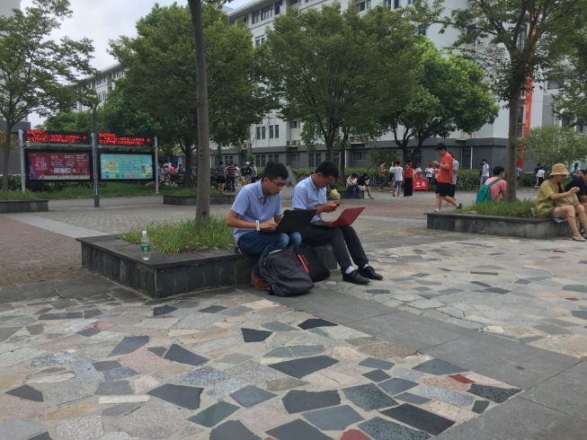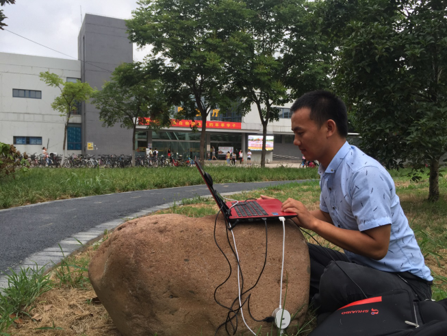 下午五點半左右,外場校園保障工作終于告一段落,他們和“東南大學”留影紀念后便匆匆趕回公司,開會探討保障工作中發現的問題并研究對策,以及明天的工作安排。趕回的途中,楊軍建說:“今天是陰天,時不時下點小雨,還是比較涼爽的。”樂呵呵的他,如此滿足。
